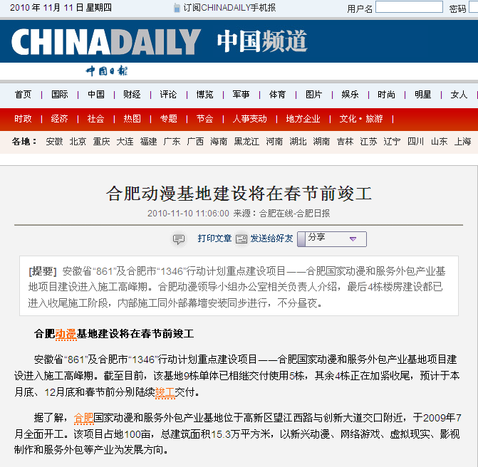 據(jù)了解,合肥國家動漫和服務(wù)外包產(chǎn)業(yè)基地位于高新區(qū)望江西路與創(chuàng)新大道交口附近,于2009年7月全面開工。該項(xiàng)目占地100畝,總建筑面積15.3萬平方米,以新興動漫、網(wǎng)絡(luò)游戲、虛擬現(xiàn)實(shí)、影視制作和服務(wù)外包等產(chǎn)業(yè)為發(fā)展方向。