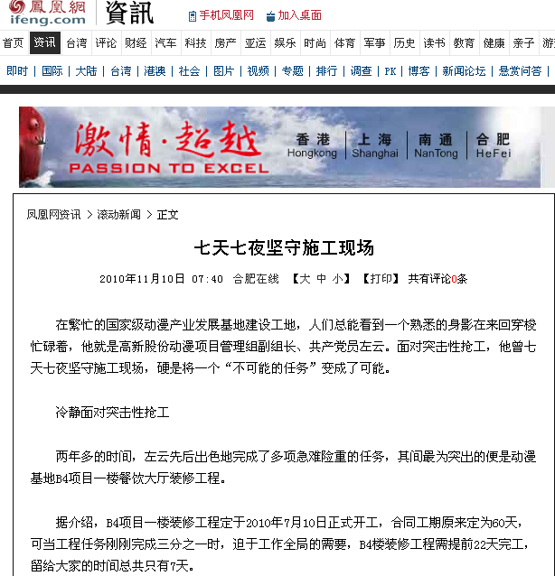 在繁忙的國(guó)家級(jí)動(dòng)漫產(chǎn)業(yè)發(fā)展基地建設(shè)工地,人們總能看到一個(gè)熟悉的身影在來回穿梭忙碌著,他就是高新股份動(dòng)漫項(xiàng)目管理組副組長(zhǎng)、共產(chǎn)黨員左云。面對(duì)突擊性搶工,他曾七天七夜堅(jiān)守施工現(xiàn)場(chǎng),硬是將一個(gè)“不可能的任務(wù)”變成了可能。