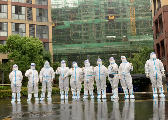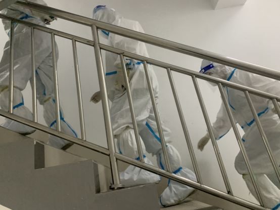 為提高工作效率,同時(shí)做到不漏一戶、不漏一人,中心員工和志愿者決定分成兩組,一組自下而上,一組自上而下,放棄坐電梯,通過步行樓梯方式逐層逐戶通知,確保每個(gè)租戶收到下樓到指定地點(diǎn)做核酸的消息。防護(hù)服的密封性極好,很好的保護(hù)了中心員工和志愿者們免受病毒的侵襲,但封閉的空間加上不停的運(yùn)動(dòng)使人流汗不止。組員們疲乏勞累時(shí)相互鼓勵(lì)打氣,只為盡快通知到每一位租戶。