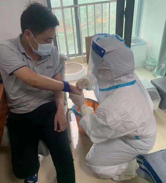 由于下著大雨,中心員工和志愿者在通知租戶做核酸的同時(shí)特別囑咐租戶帶上雨傘,通過維護(hù)現(xiàn)場秩序、安撫租戶情緒,保證核酸效率與現(xiàn)場秩序?,F(xiàn)場檢測人員為加快檢測效率,減少租戶在雨中停留時(shí)間,不懼疲勞站起來為租戶做核酸檢測。
