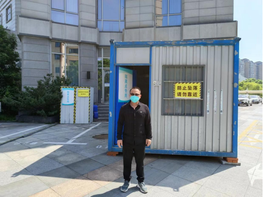 這是高林當(dāng)隔離點(diǎn)疫情防控志愿者以來的第11天。伴隨清晨的第一縷陽光,作為隔離點(diǎn)副點(diǎn)長的高林早早起床,準(zhǔn)備開始新一天的戰(zhàn)斗。用礦泉水簡單洗漱過后,他戰(zhàn)斗力飽滿的走出那個簡陋的板房,簡單的兩張床、兩張椅子、一個辦公桌就是他最堅守的陣地。出于安全考慮任何地方都不能去,他把吃住行都濃縮到這一方小小空間中。這個臨時搭建起來的建筑,就是他臨時的“家”。沒有地方可以淋浴,那就拿熱水壺?zé)c(diǎn)熱水簡單洗漱;沒有衛(wèi)生間,上廁所只能就去酒店一樓;沒有廚房,吃飯就在辦公桌上吃著酒店送來的盒飯。