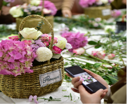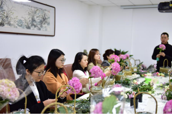春風(fēng)和煦,花香四溢?;顒?dòng)現(xiàn)場(chǎng),資深花藝?yán)蠋煆幕ú?、插花類型及?shí)操過(guò)程,細(xì)致地向大家講解了插花的基本知識(shí)和技巧,并將不同類型的插花風(fēng)格生動(dòng)地展現(xiàn)在大家面前?!芭駛儭痹诶蠋煹南ば闹笇?dǎo)下,將玫瑰、繡球、洋桔梗、雛菊等各色花卉修剪、整枝,或高低錯(cuò)落,或俯仰呼應(yīng),用自己靈巧的雙手,盡情發(fā)揮創(chuàng)造力。修飾好的花籃花團(tuán)錦簇,大家手捧花籃紛紛留下自已最靚麗的一瞬間,活動(dòng)現(xiàn)場(chǎng)歡聲笑語(yǔ),其樂(lè)融融,室內(nèi)花香四溢,充滿春天的氣息。