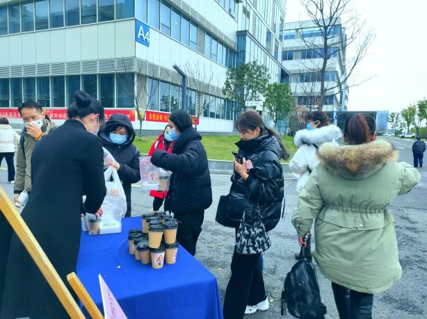 紅彤彤的冰糖雪球、剛出鍋的炒板栗、清香可口的瓜子花生以及一杯隨時可沖泡的暖冬姜茶組合成了“暖冬四件套”。清晨,園區(qū)工作人員來到提前布置好的活動場地,將打包好的暖冬套餐整齊擺列在桌子上,為企業(yè)職工、核酸采樣工作者、社區(qū)志愿者、環(huán)衛(wèi)和食堂工作人員等送上定制款“暖冬四件套”,活動現(xiàn)場溫馨有序,參與者都紛紛表示感謝。