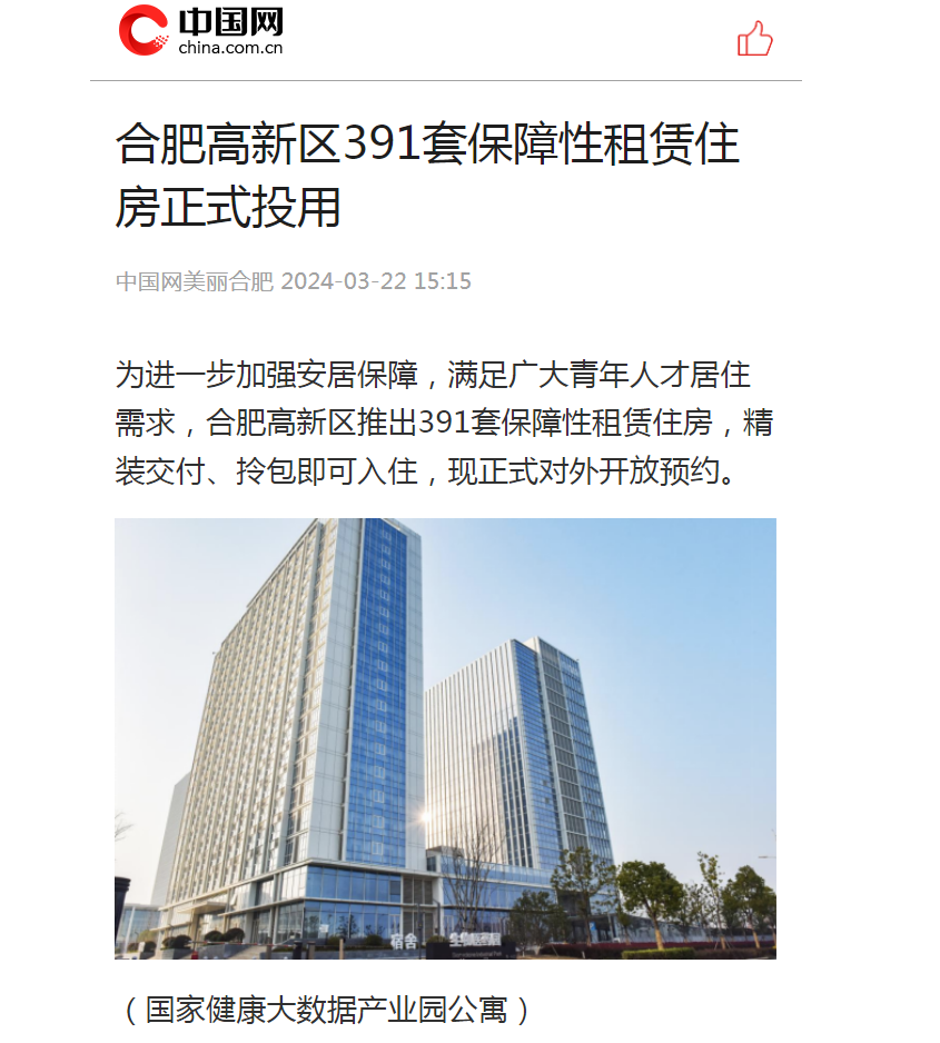 為進一步加強安居保障,滿足廣大青年人才居住需求,合肥高新區(qū)推出391套保障性租賃住房,精裝交付、拎包即可入住,現(xiàn)正式對外開放預(yù)約。