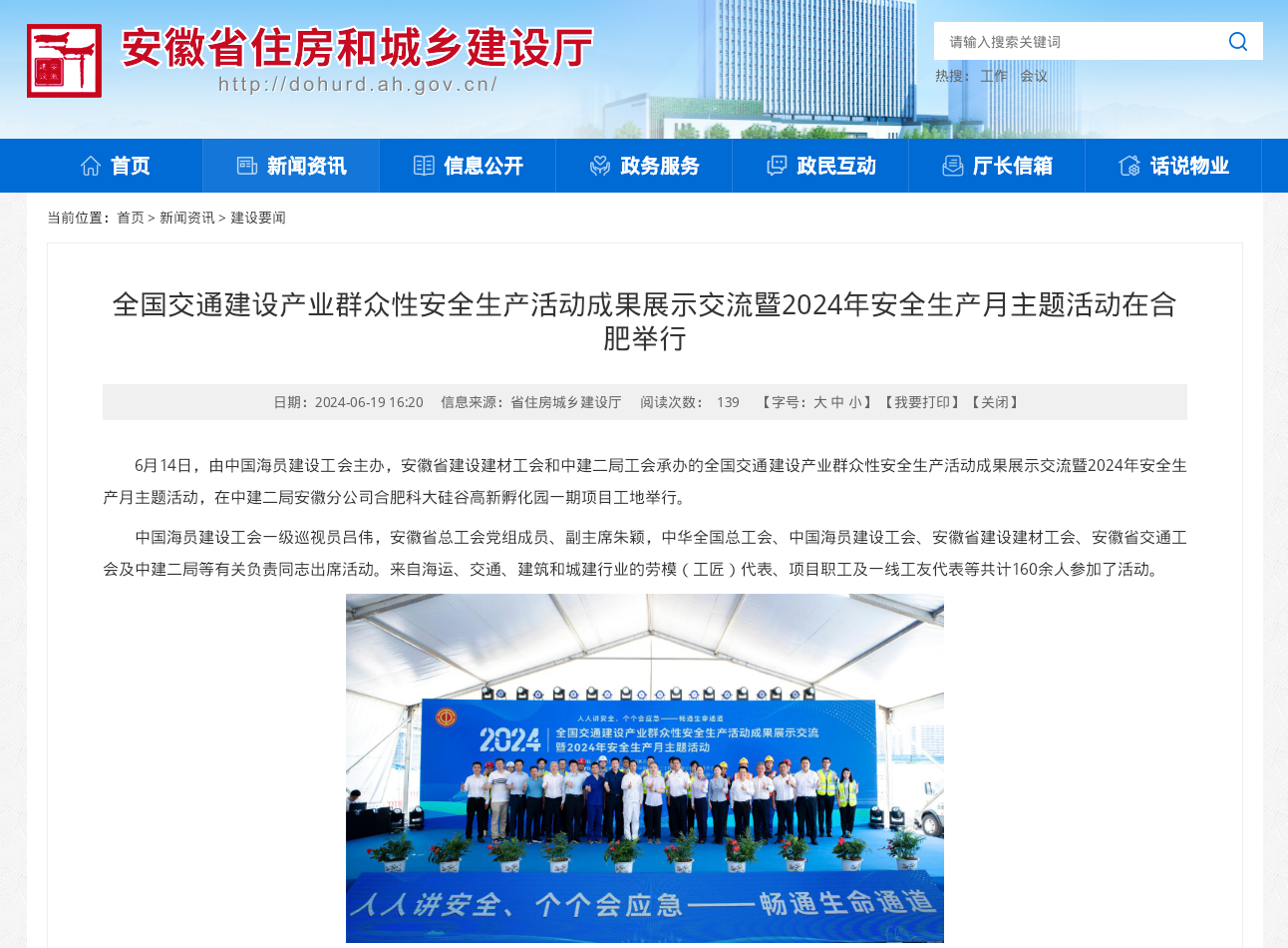 6月14日,由中國(guó)海員建設(shè)工會(huì)主辦,安徽省建設(shè)建材工會(huì)和中建二局工會(huì)承辦的全國(guó)交通建設(shè)產(chǎn)業(yè)群眾性安全生產(chǎn)活動(dòng)成果展示交流暨2024年安全生產(chǎn)月主題活動(dòng),在中建二局安徽分公司合肥科大硅谷高新孵化園一期項(xiàng)目工地舉行。