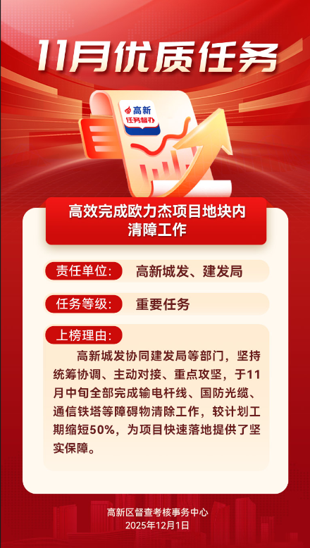近日,高新城發(fā)集團“高效完成歐力杰項目地塊內(nèi)清障工作”被督考中心評為11月優(yōu)質(zhì)任務(wù)。